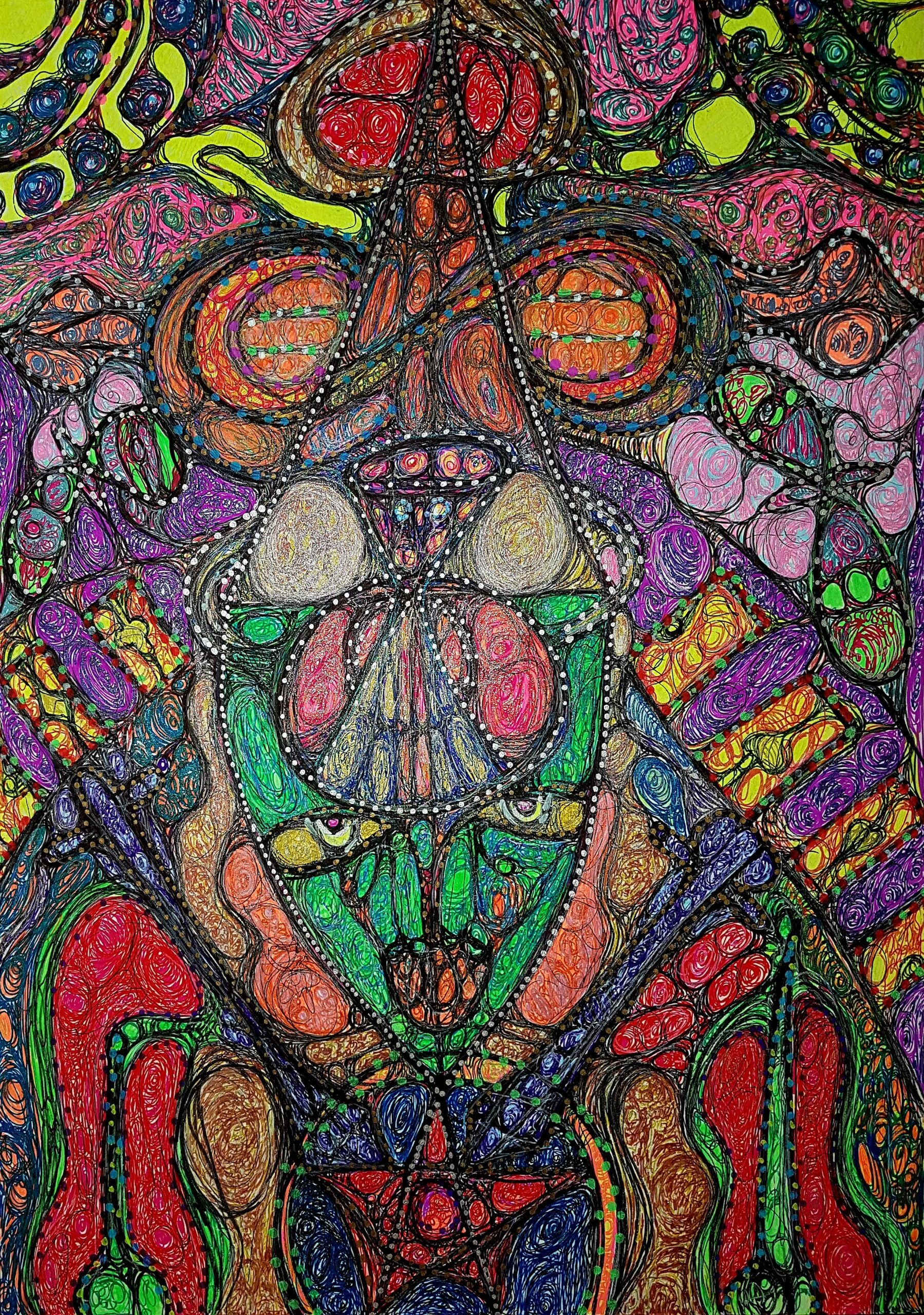 Uma das características do mago é ele nunca se revelar diretamente. Ele pode usar uma ou várias máscaras. Homem, mulher ou andrógeno, apresenta potencialidades, como ter superpoderes, como o da observação, ou apenas fingir que reúne habilidades especiais. O presente trabalho tem um título que remete a essas ambivalências. A imagem em si mesma, que inclui a mudança de cor sob o efeito da luz negra, também apresenta a magia de se alterar de acordo com as condições a que é submetida. Analogamente, todos somos magos. A questão é em quais condições e circunstâncias isso é desenvolvido.